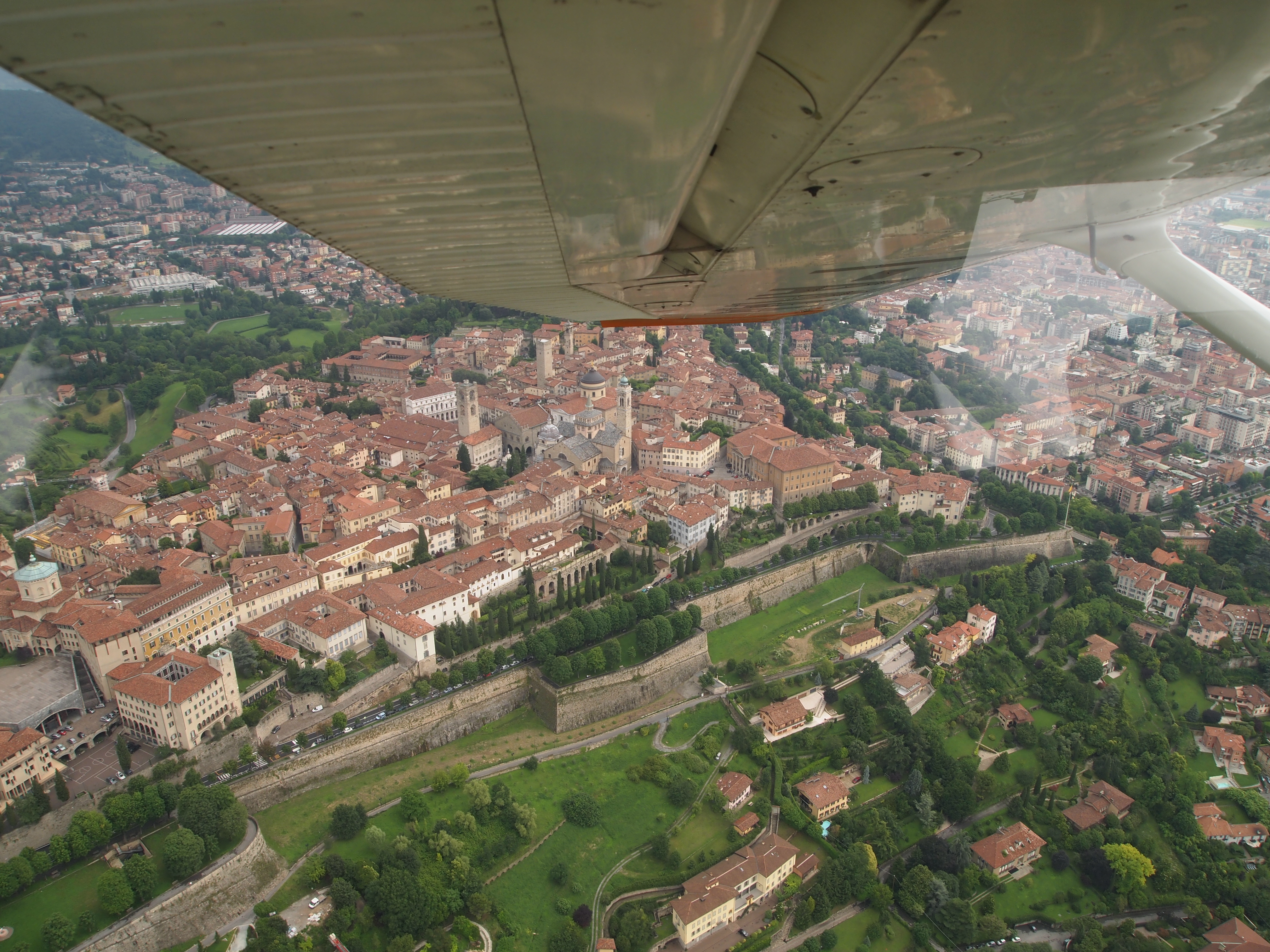 Op weg terug naar het vliegveld vlogen we nog over het oude stadsdeel van Bergamo. Een schitterend uitzicht over de oude stadsmuren en de oude huizen die al heel wat geschiedenis hadden meegemaakt.