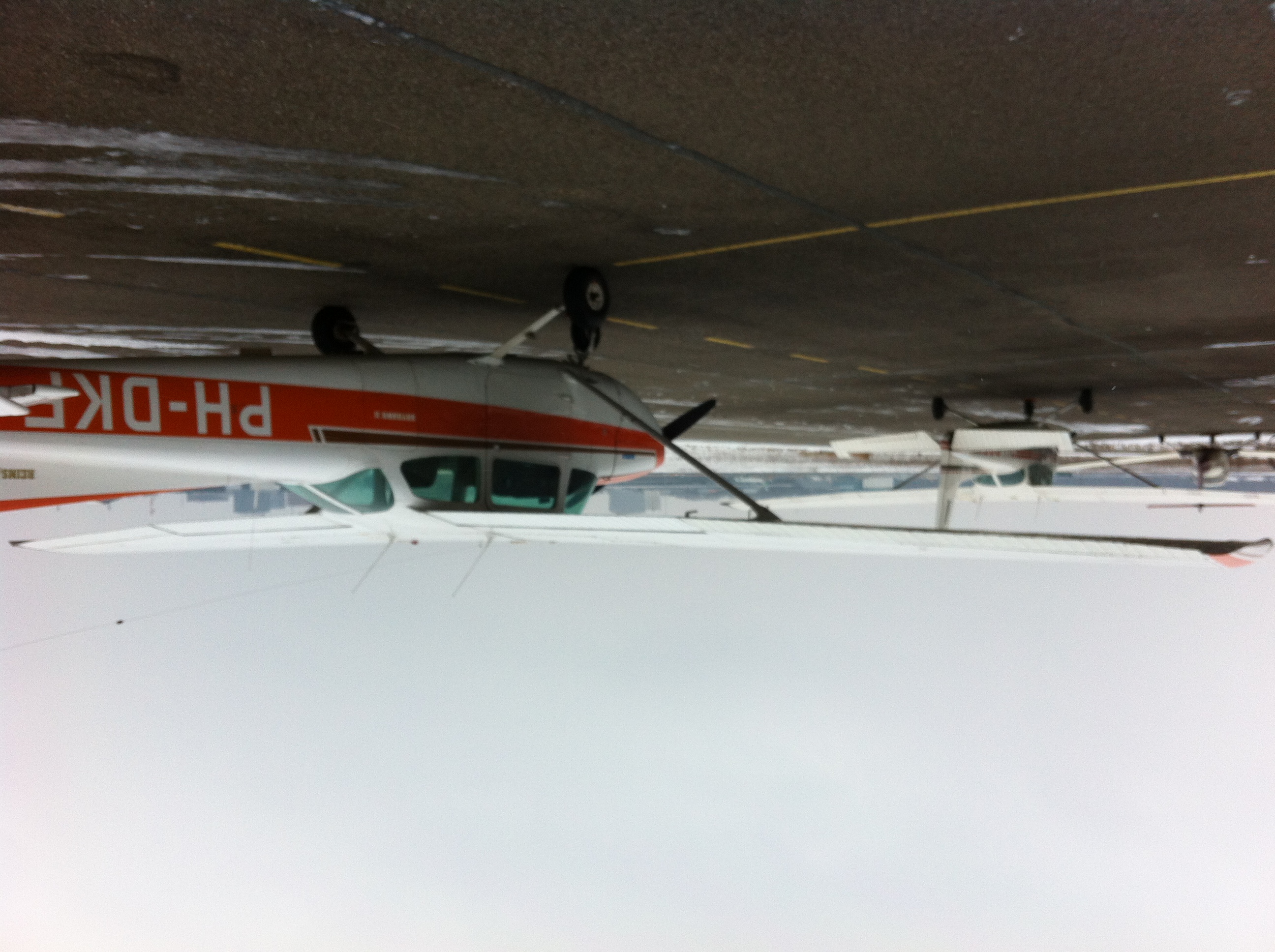 De controle van het vliegtuig deden we in het comfort van de hanger; buiten was een gure wind, die redelijk cross op de baan stond; bij de landingen zouden we ook nog netjes de crosswind landing kunnen oefenen.